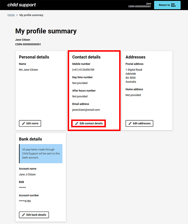 Step 2: update contact details with My profile summary in the redesigned Child Support online account