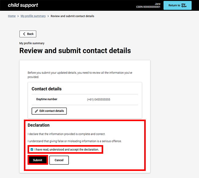 If all the details are correct, read the declaration. If you understand and agree with the declaration, select I have read, understood and accept the declaration, then select Submit.