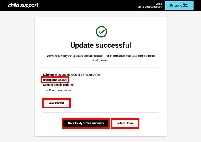 Step 4: receipt from My profile summary in the redesigned Child Support online account