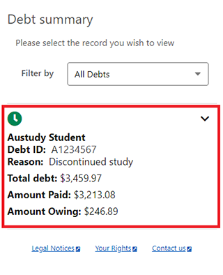 Move down the screen to view current and previous debts you’ve repaid, including: