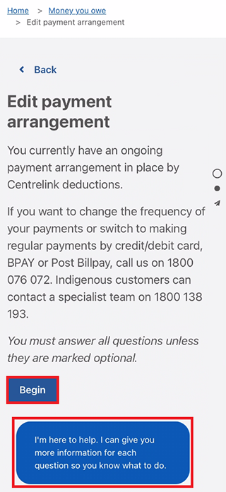 Select Begin to set up a payment arrangement.