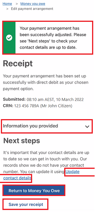 We’ll tell you if your payment arrangement has been successfully adjusted. We’ll give you a receipt to confirm the changes to your payment arrangement.