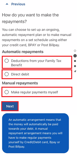 In this example, we’ll select the Family Tax Benefit payment to repay the debt.