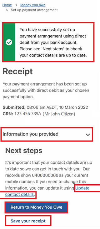 We’ll tell you if your payment set up has been successful. We’ll give you a receipt to confirm the changes to your new payment arrangement.