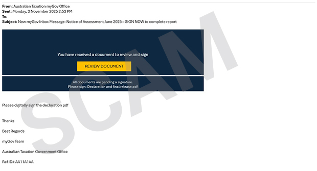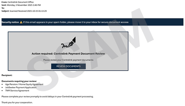 The scammer will usually contact you by email. The email will ask you to click on a link to review and sign a digital document. The email may say it’s to finalise a payment or benefit.