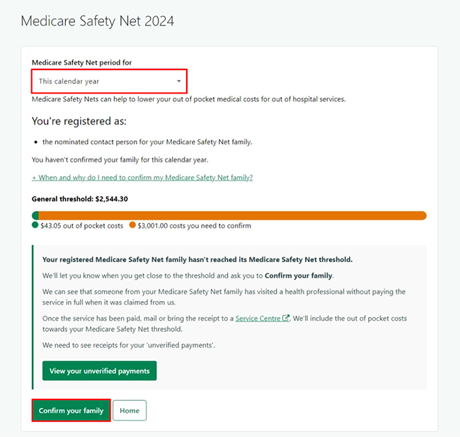 Select the year you want to confirm from the Medicare Safety Net period for dropdown menu.