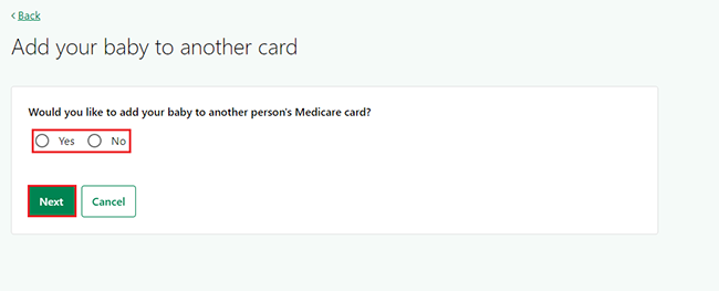 You can add your baby to another person’s Medicare card. This can be the other parent or a full time carer. Select either: