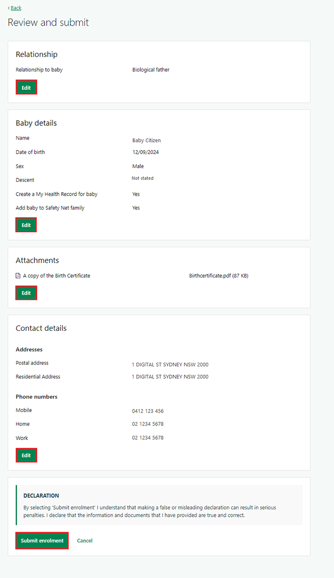Read your baby’s enrolment details on this page and make sure they’re correct. If you need to make changes, select Edit.