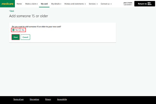 If you want to add someone 15 or older to your card, read our online guide, Add someone to my Medicare card.