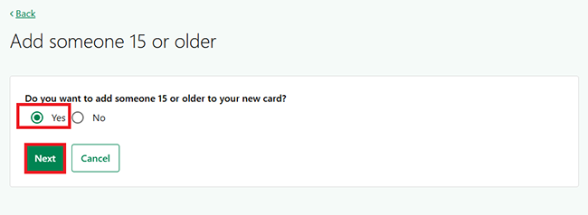 In this example, we’ll select Yes to add someone 15 or older to the new card.