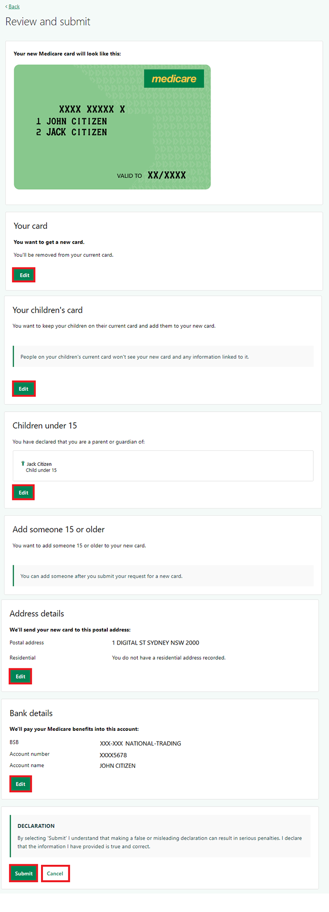 If all the information is correct, read the declaration. If you understand and agree with the declaration, select Submit.