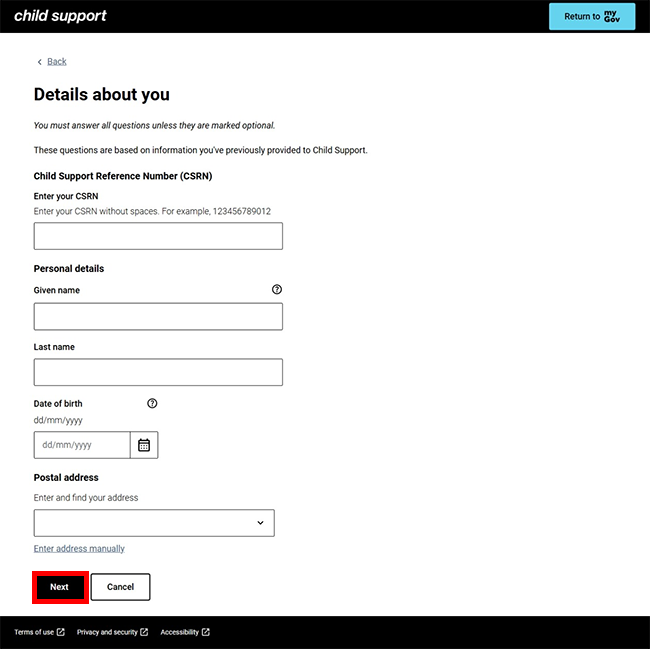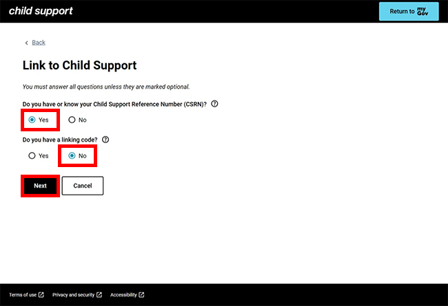 We’ll ask you if you know your Child Support Reference Number (CSRN) and if you have a linking code.