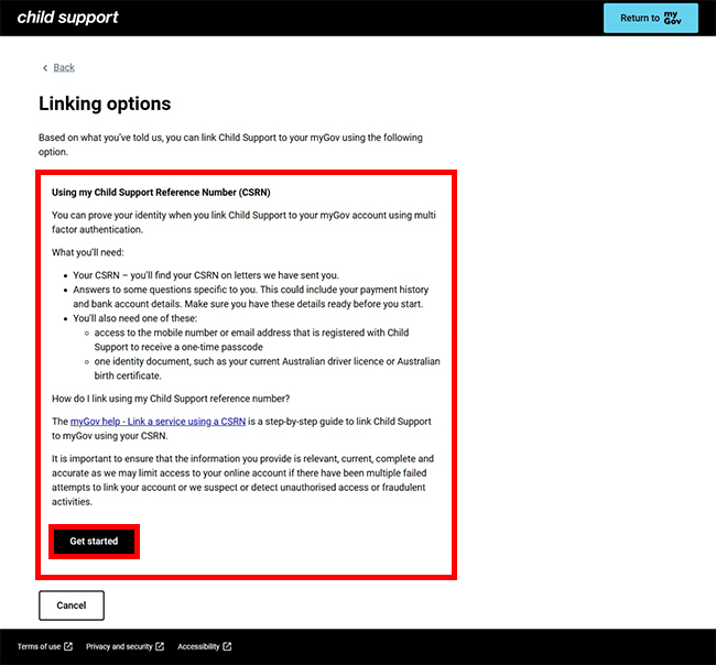 Select Get started in the Using my Child Support Reference Number (CSRN) box.
