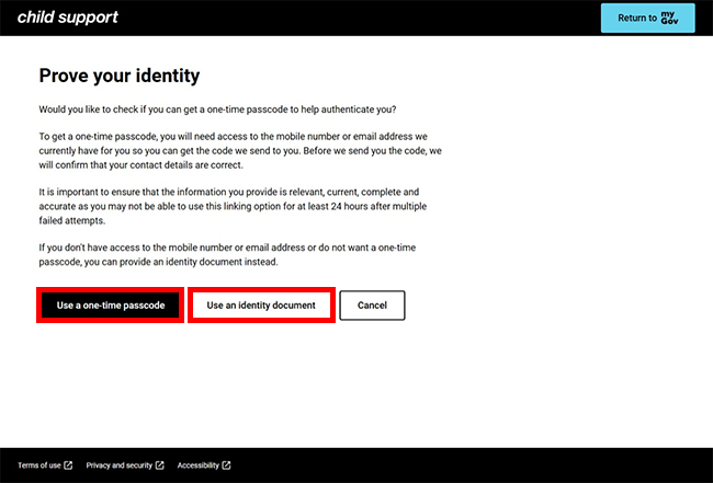 - access to the mobile number or email address registered with Child Support to receive a one-time passcode
