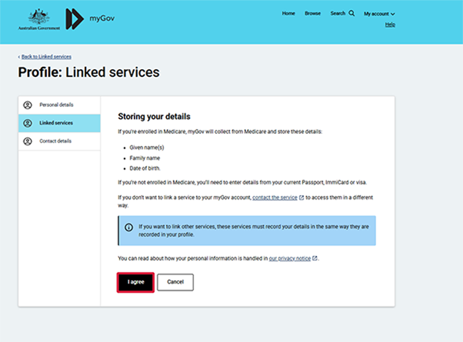 If you agree to myGov storing your Given names, Family name and Date of birth in your myGov profile, select I agree.