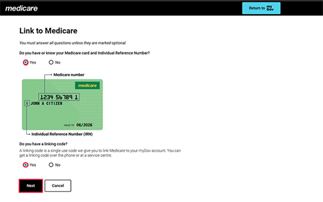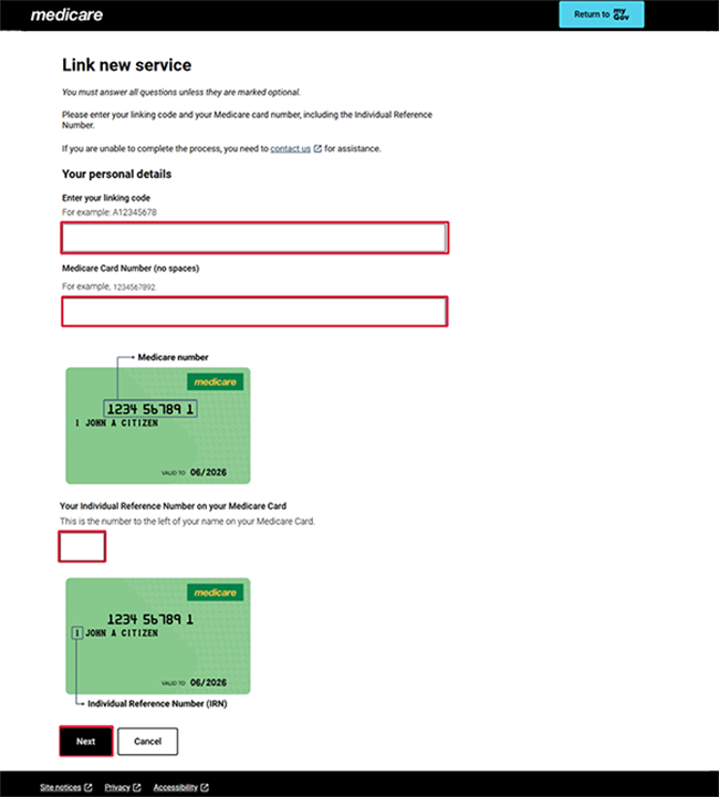 Enter your Linking Code, Medicare Card Number and Individual Reference Number.