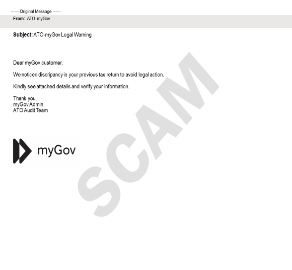Scammers may also tell you there’s a problem with your tax return. They threaten legal action if you don’t enter your details into a website. They often begin the email by saying ‘Dear myGov Customer’ and include an attachment asking you to confirm your details.