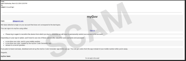 Scammers may send you an email saying there’s been suspicious activity or sign ins to your myGov account from unknown devices.